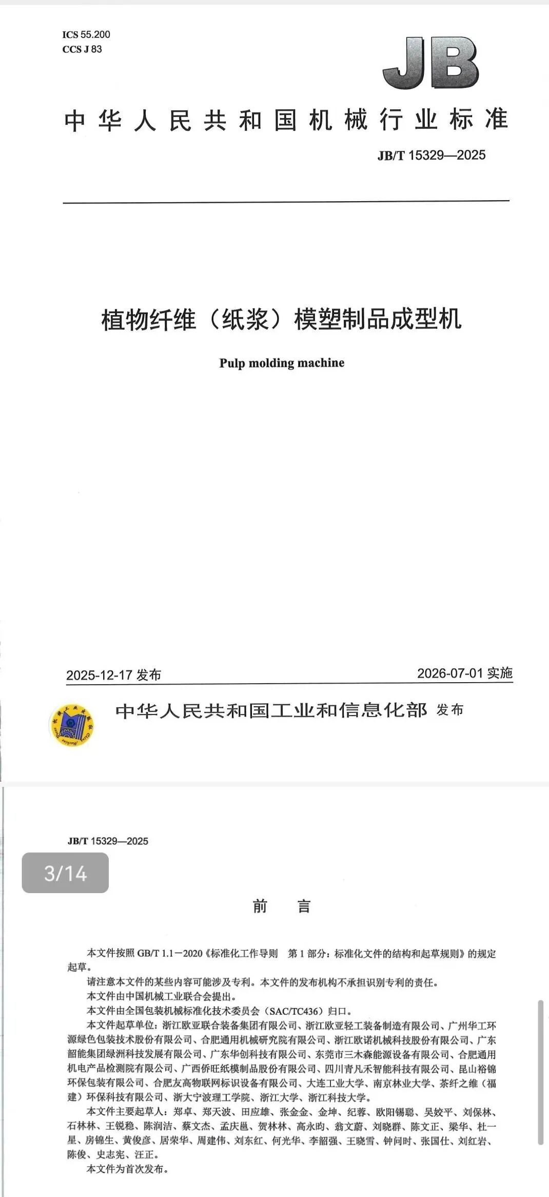 中国纸浆模塑设备行业标准——《植物纤维(纸浆)模塑制品成型机》,2025年12月17日中国工业和信息化部正式发布,2026年7月1日起实施。该标准由浙江欧亚联合装备集团有限公司负责起草,行业内多家企业参与。